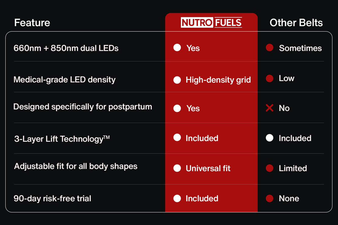 When it comes to choosing the right red light therapy belt, not all options are created equal. Nutrofuels' Red Light Belt is specifically designed for superior performance, with features that cater topostpartum recovery, adjustable fit for all body types,and cutting-edge technology like our3-Layer Lift Technology™. Unlike other belts, our product boasts medical-grade LED density and a 90-day risk-free trial, ensuring you receive the highest quality and value. Compare for yourself and discover why Nutrofuels is the clear choice.