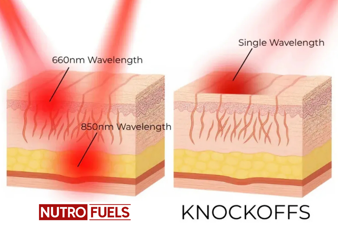 Nutrofuels' Red Light Belt uses both 660nm and 850nm dual wavelengthsto deeply targetskin layers, ensuring more effective treatment. Unlike other belts that use a single wavelength, our advanced technology penetrates further for better results, helping to restore skin firmness and promote healing from within.Choose Nutrofuels for optimal therapy and superiorperformance.